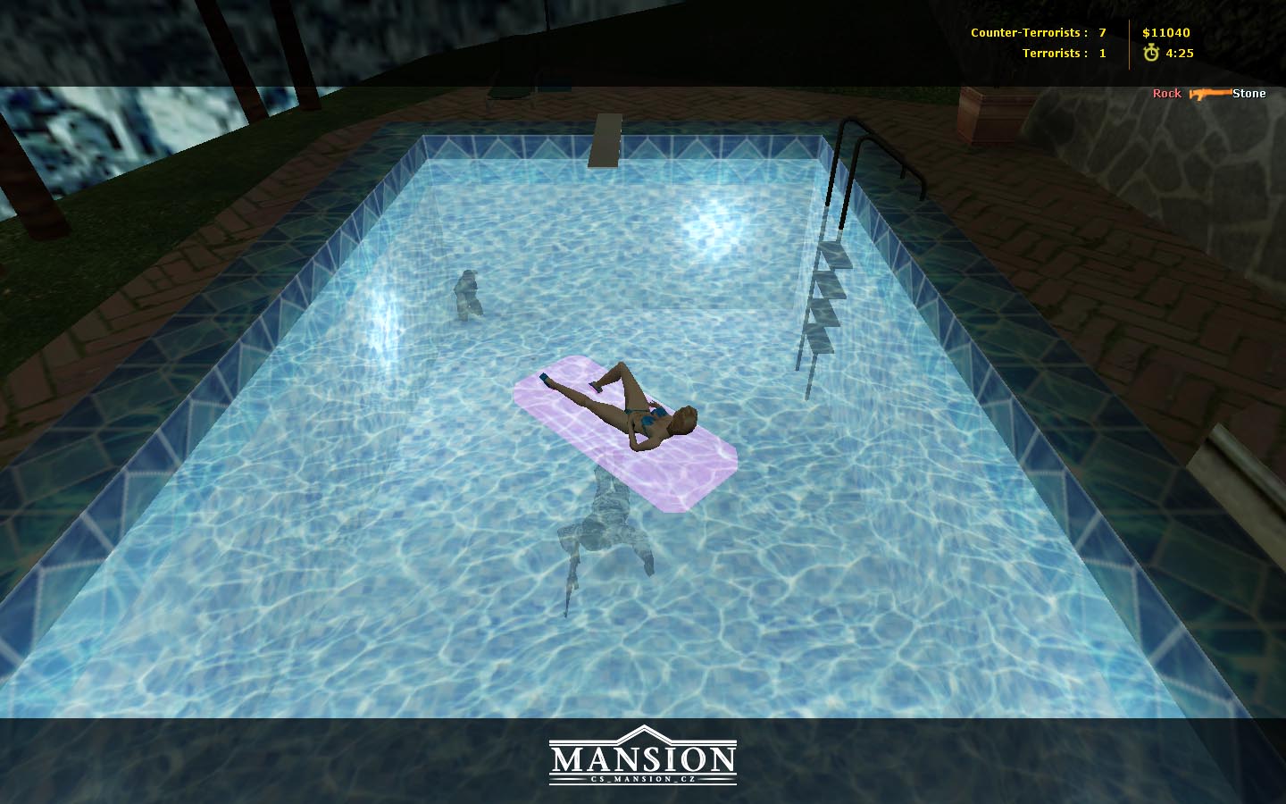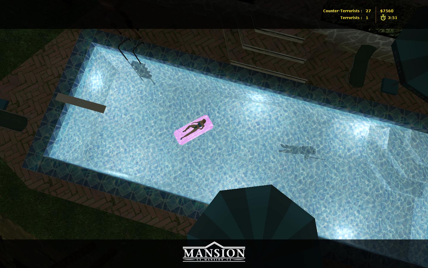 1) I love the map falloff. You may attach a jumpable fence (at some offset from the border) to protect players so that they may still kill themselves. 2) I have very strange lags when I am looking at the front of the house standing in front of it and when looking at fasade when standing somewhere in the main hall. My FPS drops from 60 to 10+ in sharp spikes with averaging at around 30 FPS. GPU usage is almost zero but CPU usage is 100% (one core is fully utilised). My CPU is Core 2 Duo E8500 (3+ GHz). I use one of last CS1.6 from steam with beta update. I am "Creating server" in the game. Launching HLDS gives same effect. My config: http://rghost.net/58451959 Some old nonsteam CS lags even worse. 3) I wish you have done the outer view better - walls and such. All rough edges are visible from heli. 4) The rear balcony is unsimmetrical - you cannot fall through the empty space between the right small roof and the balcony but you can fall through it on the left. 5) You can make dress hanger near the hostages deeper so than someone may camp there and be fully hidden. You can also make dresses from the dress truck in hallway transparent so that somebody can hide there too. 6) You can also make the door to the shower jumpable from the shell so that somebody can camp there. 7) You may make dropping from heli into water on the backyard easier. It is complex for unexpirienced players now. 8) Make the chick in the swimming pool destroyable. ))) |